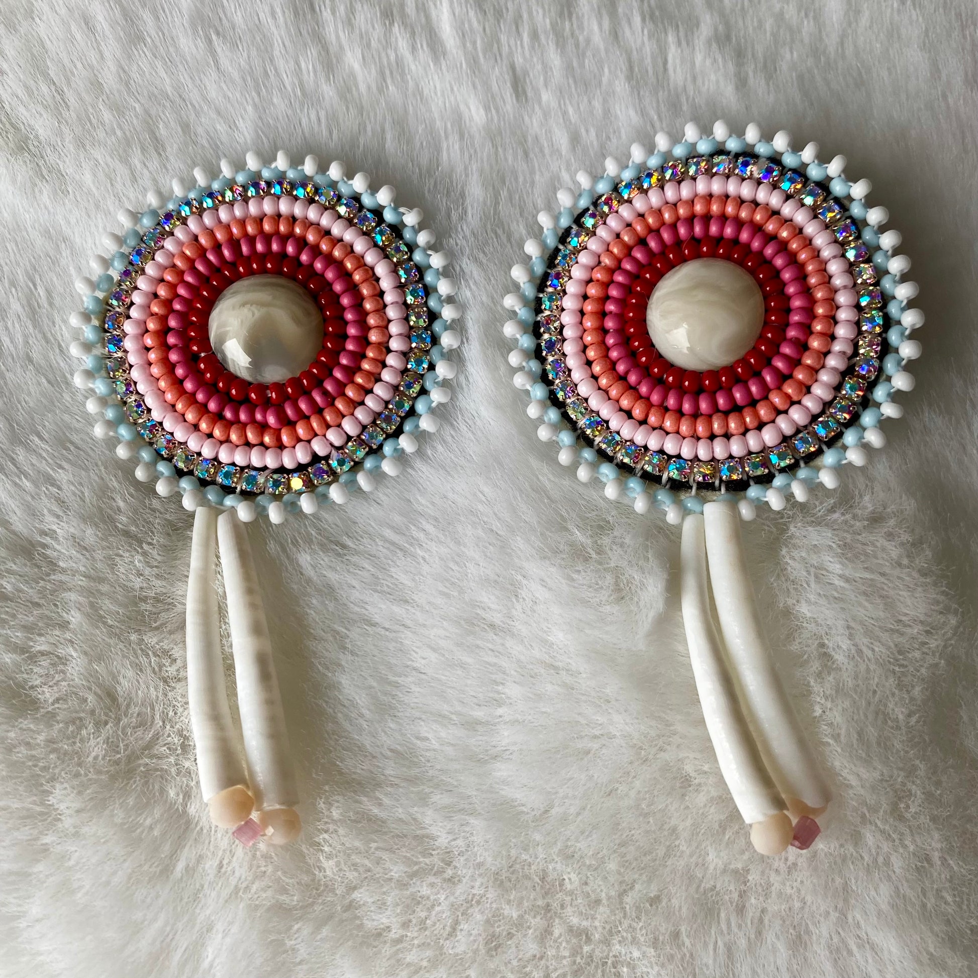 Bright & sparkly, these earrings are made with seed beads & dentallium. Backed with vegan leather.